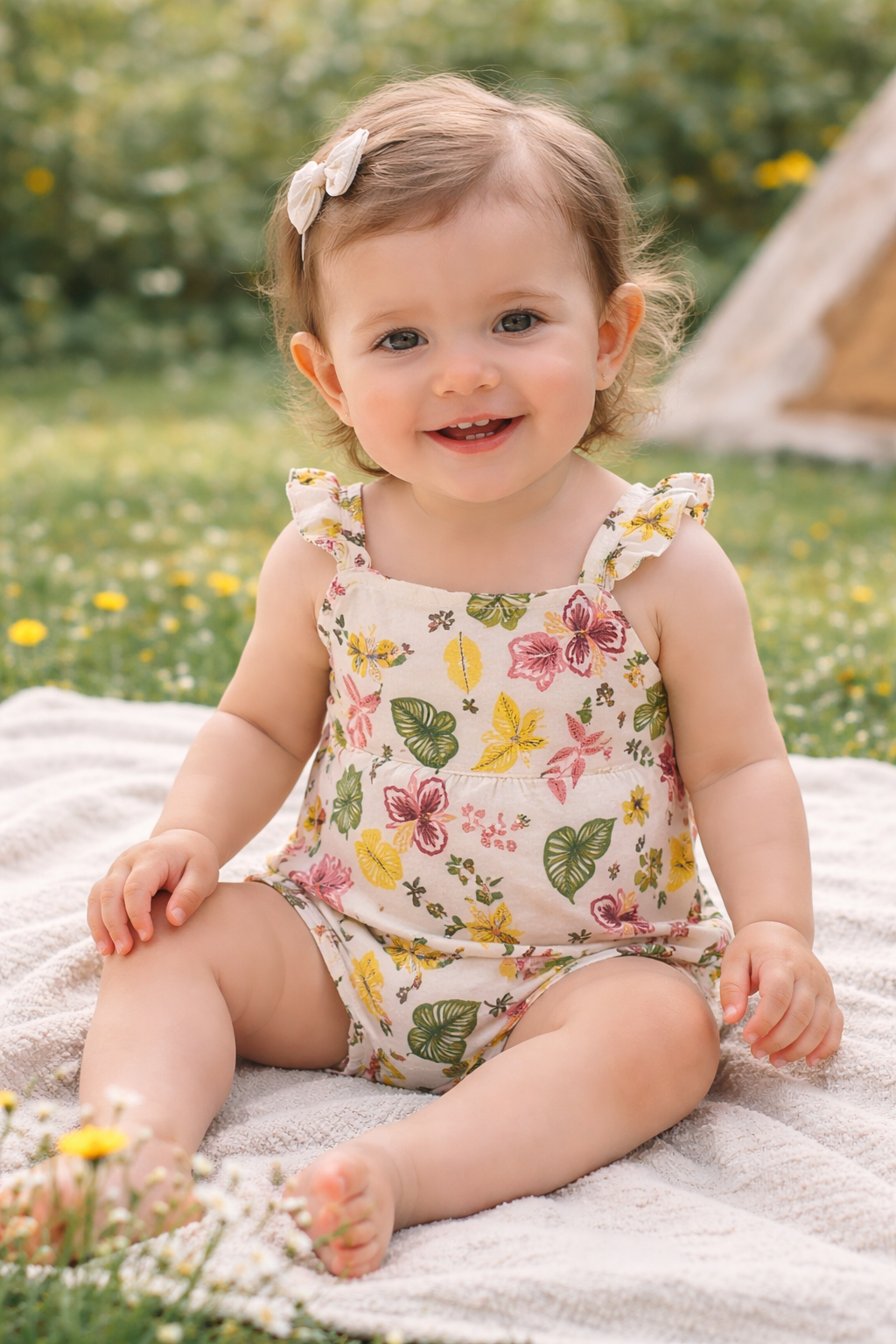 Crafted from soft, breathable, baby-friendly fabric, it keeps your little one comfortable throughout the day while being gentle on delicate skin. The multi-flower design adds a playful and vibrant feel, making it perfect for sunny outings, playdates, and capturing those sweet seasonal moments.
