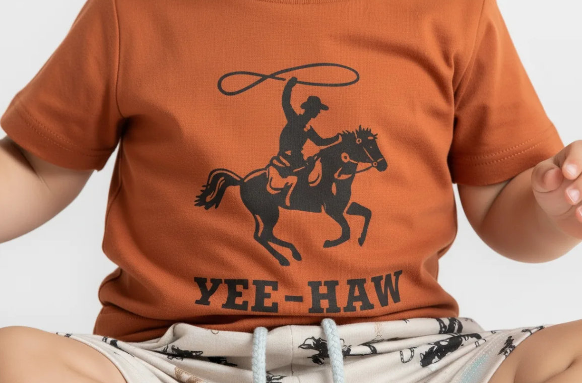 Western-Inspired Print: A vibrant, gender-neutral design featuring classic “Yee-Haw” motifs that won’t fade after multiple washes.